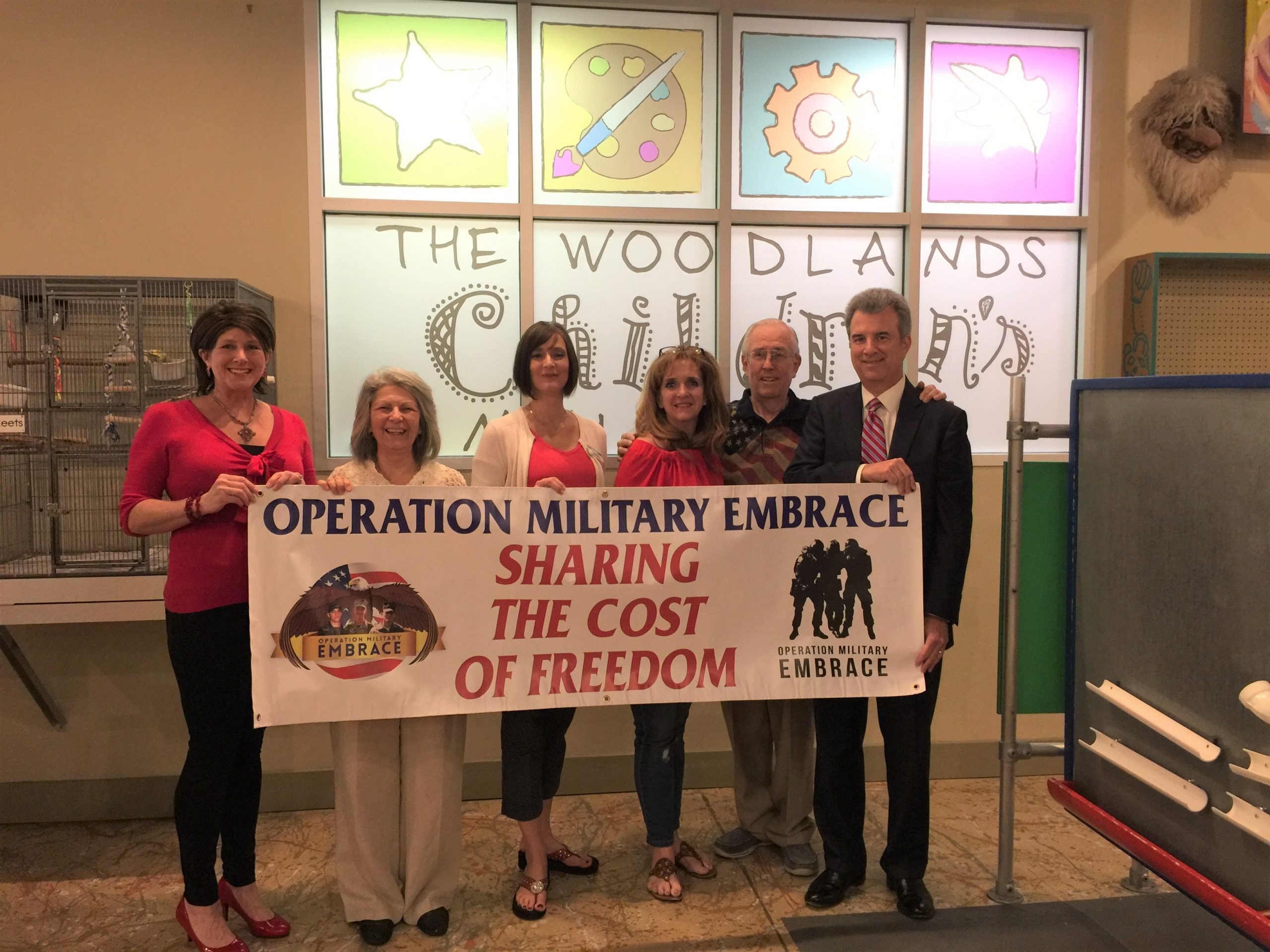 From Left to Right Courtney Coats–The Woodlands Children’s Museum, Angela Colton–Executive Director of The Woodlands Children’s Museum, Ana Noe–Educational and Outreach Coordinator of The Woodlands Children’s Museum, Kasey Rogers–Community Relations and Events Coordinator of The Woodlands Children’s Museum, Dennis Bernhart-Care Package Coordinator for Operation Military Embrace, Jim Carlton–Managing Director of Carlton, Hofferkamp and Jenks Wealth Management